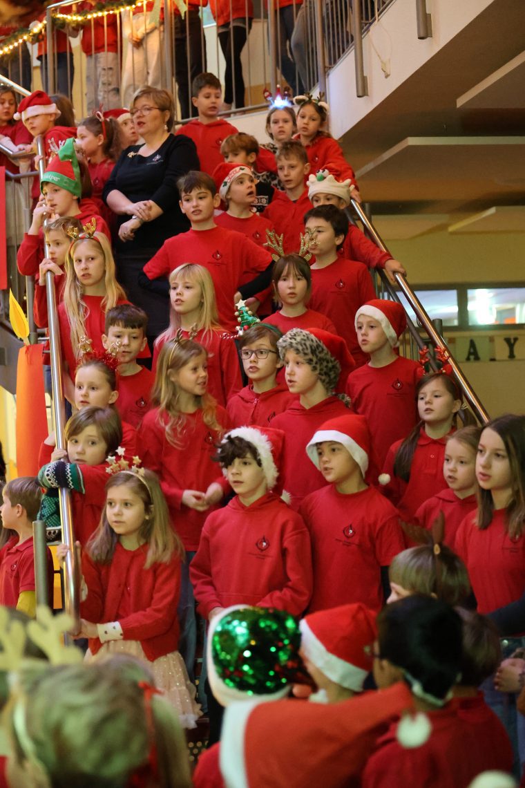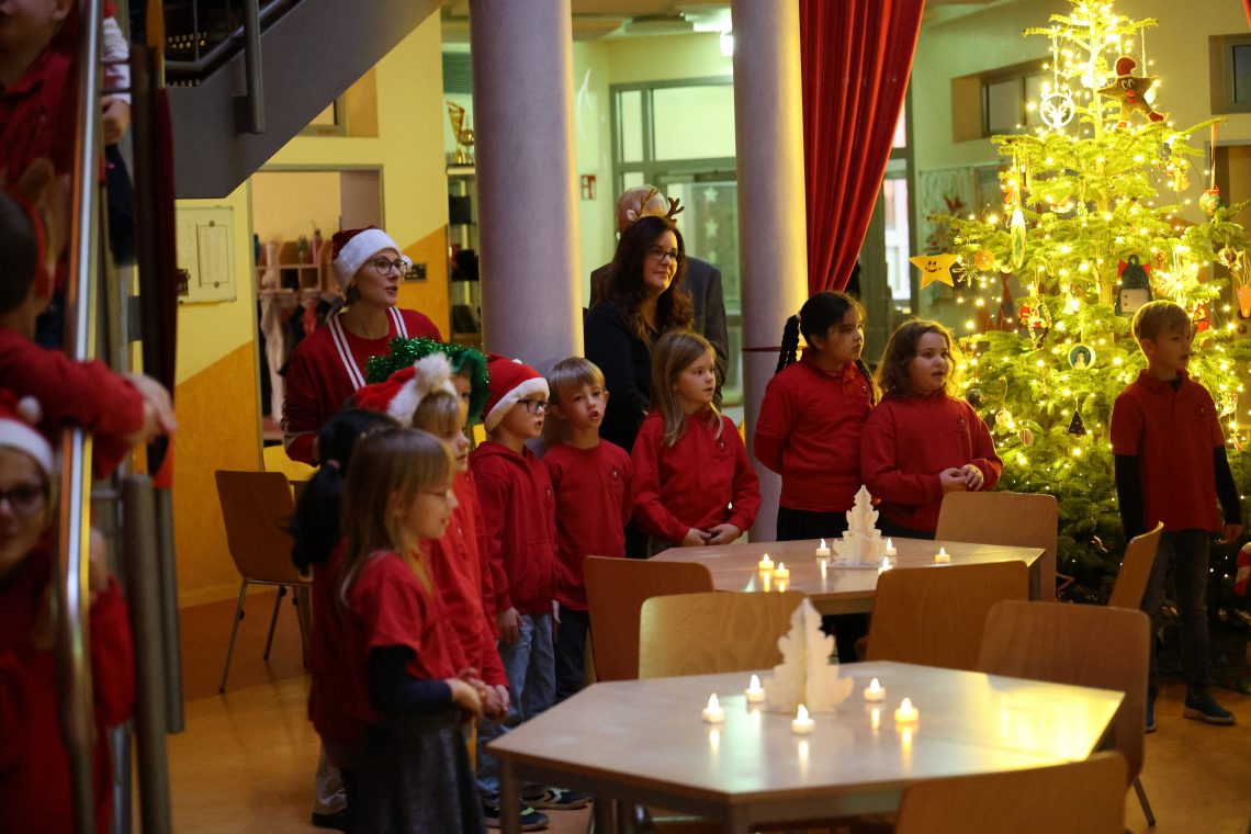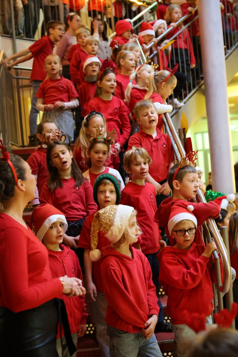 Am letzten Schultag vor den Weihnachtsferien sorgte das traditionelle Treppensingen für eine festliche Stimmung in unserer Schule. Gemeinsam sangen die Schülerinnen und Schüler Weihnachtslieder in deutscher und englischer Sprache und erfüllten das Treppenhaus mit weihnachtlichen Klängen.