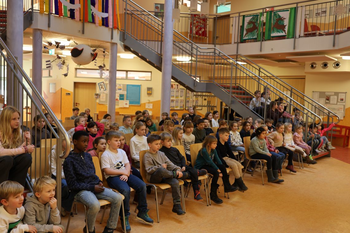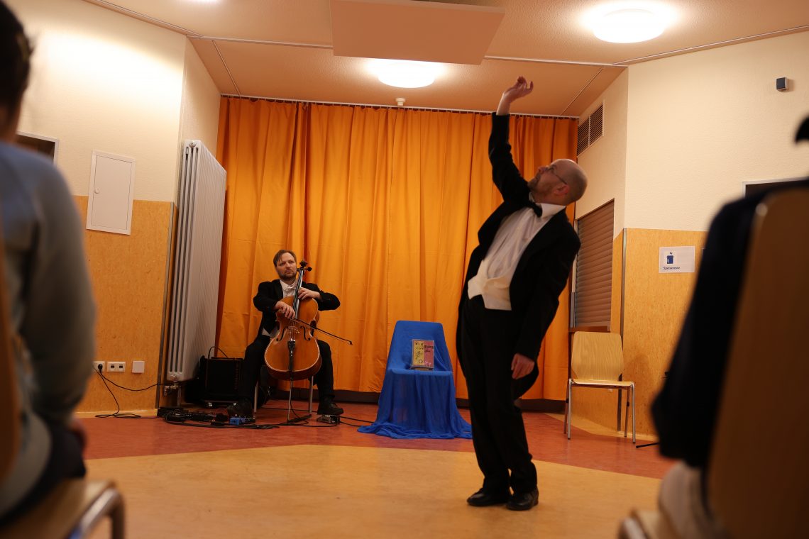 In der Schulhalle der Bilingualen Grundschule sahen die jungen Zuschauerinnen und Zuschauer ein lyrisch- musikalisches Märchen, welches das Publikum durch verschiedene Gedichte und musikalische Begleitung ins Reich der Lyrik entführte.