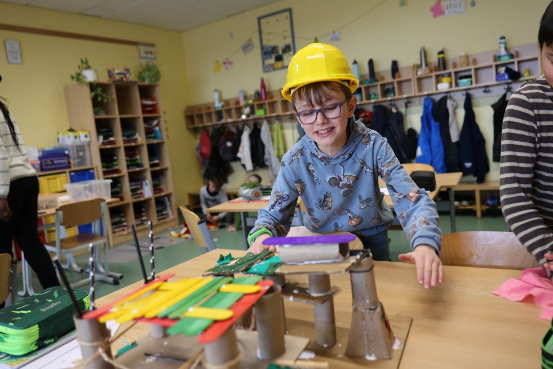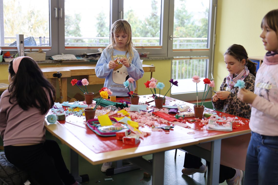 Im Schulgarten wurde fleißig gearbeitet, gebaut und gepflegt – ein praktischer Beitrag zur Nachhaltigkeit. Kreative Hände gestalteten außerdem wunderschöne Blumen aus Krepppapier, die den Frühling ins Schulhaus brachten. Beim Brückenbau-Projekt waren technisches Geschick und Teamarbeit gefragt.